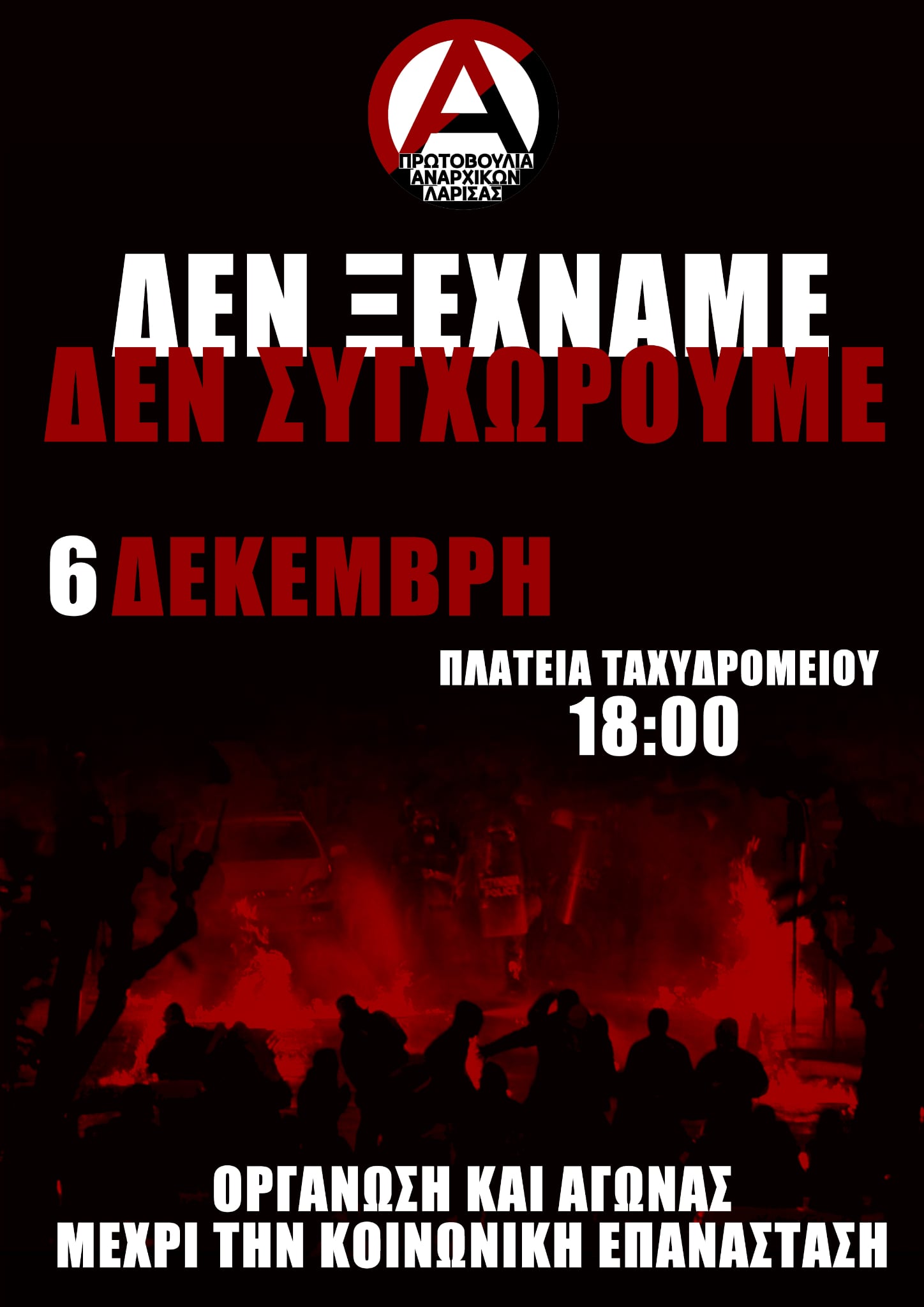 Σε μία σύνδεση του τότε με το σήμερα, με ζωντανή τη μνήμη όσων πραγματώθηκαν εκείνον τον Δεκέμβρη η ανάγκη για οργάνωση των από τα κάτω είναι η μόνη επιλογή. Η οργάνωση στα σχολεία και τις σχολές, η συμμετοχή και η δημιουργία σωματείων βάσης, η συνδιαμόρφωση σε συνελεύσεις γειτονιάς είναι η μόνη διέξοδος για μία ελεύθερη ζωή. Μέσα από αδιαμεσολάβητους και ακηδεμόνευτους αγώνες μπορούμε σε όλα τα κοινωνικά μέτωπα να διεκδικήσουμε και να πάρουμε πίσω όλα εκείνα που προσπαθούν να μας στερήσουν. Την αλληλεγγύη και την αξιοπρέπεια. Στο δρόμο του αγώνα, με στόχο την οργάνωση και τη συλλογικοποίηση, μπορούμε να καταρρίψουμε το καθεστώς τρόμου που επιβάλλει κράτος και καπιταλισμός για τη δημιουργία μίας κοινωνίας ισότητας αλληλεγγύης και ελευθερίας.