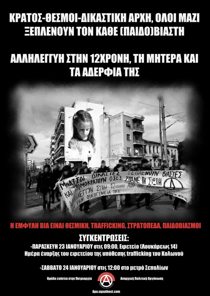 Στις 23 Γενάρη του 2026, ξεκινά η εκδίκαση σε δεύτερο βαθμό της υπόθεσης της τότε 12χρονης από τον Κολωνό ενάντια στο κύκλωμα trafficking που την εξέδιδε και την κακοποιούσε. Η απόφαση του πρωτόδικου δικαστηρίου, έπειτα από τη συνεχή και δυναμική κινητοποίηση αλληλέγγυου κόσμου, είχε δικαιώσει τη 12χρονη κοπέλα και την οικογένειά της, απαλλάσσοντας τη μητέρα από το στημένο κατηγορητήριο που της είχε αποδοθεί και καταδικάζοντας τον παιδοβιαστή και μαστροπό Ηλία Μίχο και τον αποκαλούμενο «Μιχάλη» καθώς και άλλους 17 κατηγορούμενους -που χαρακτηρίστηκαν ως «πελάτες» – για βιασμό ανήλικου έναντι αμοιβής και άλλες κατηγορίες. Επίσης, κατά τη δεύτερη δίκη που προέκυψε από τη δεύτερη δικογραφία που σχηματίστηκε, καταδικάστηκαν 11 ακόμα παιδοβιαστές- από το σύνολο των 17 κατηγορούμενων.