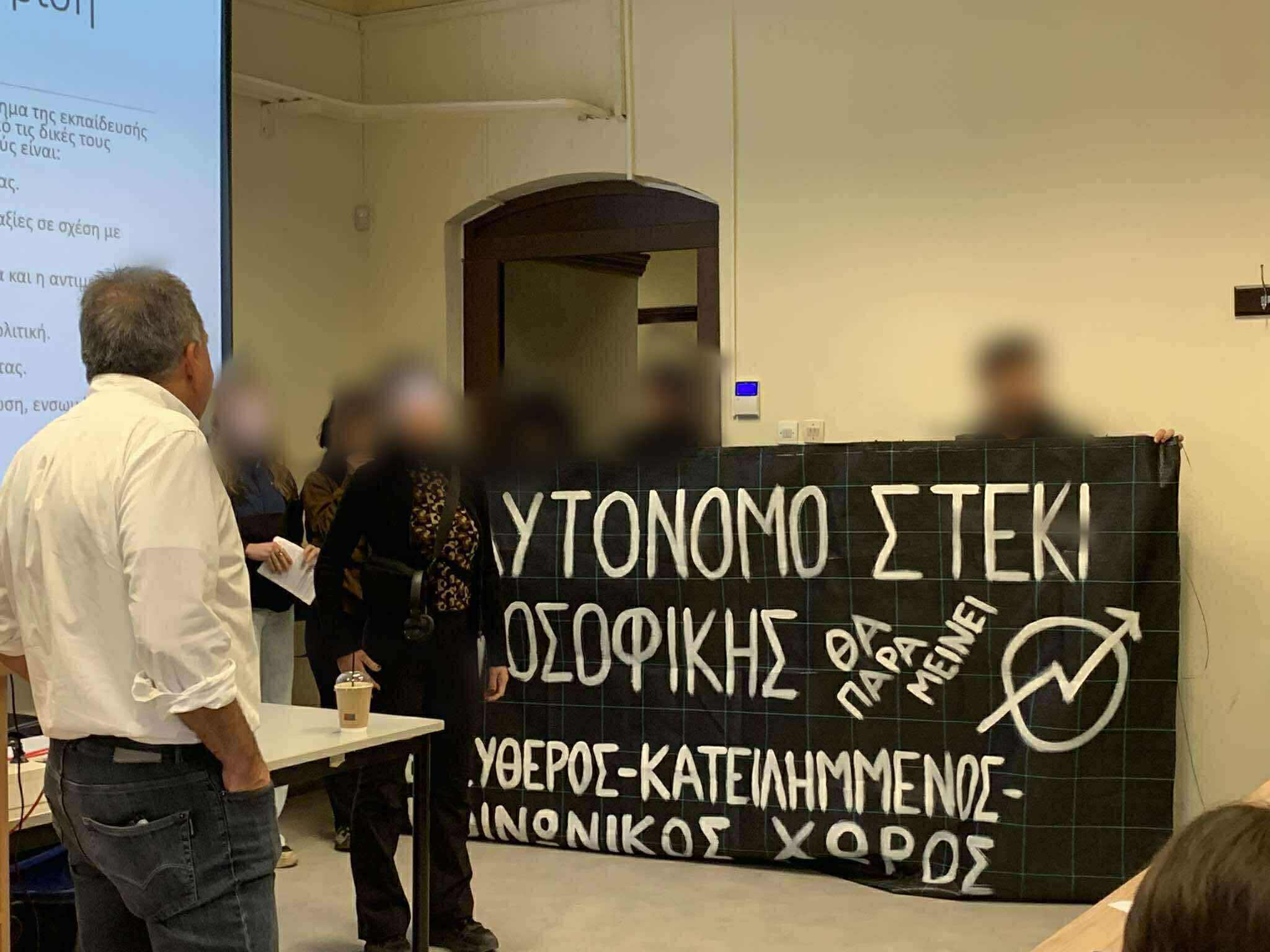 Σήμερα το πρωί πραγματοποιήσαμε, ως αυτόνομο στέκι φιλοσοφικής, παρέμβαση σε μάθημα του κοσμήτορα της σχολής κ. Τσιουμη. Την προηγούμενη εβδομάδα μάς ανακοίνωσε πως πρέπει να φύγουμε από το στέκι μας και να "μετακομίσουμε" σε άλλον χώρο της σχολής λόγω μεταφοράς γραμματειών από την πρυτανεία στη φιλοσοφική και πως, αν δεν φύγουμε, θα έρθουν τα ΜΑΤ να μας βγάλουν. Με λίγα λόγια, αφού μας προειδοποίησε για την επικείμενη εκκένωση μας, αυτός θεώρησε πως έκανε το καθήκον του και αποποιήθηκε των ευθυνών του σε περίπτωση μπούκας. Για αυτόν τον λόγο, αίτημα της σημερινής παρέμβασης ήταν να εγκαταλείψει αυτή τη μεσοβέζικη και δήθεν προοδευτική θέση του και να μάς στηρίξει έμπρακτα βγάζοντας ανακοίνωση υπεράσπισης του στεκιού μας. Αυτός αρνήθηκε κατηγορηματικά αυτήν την πρόταση και έδωσε την υπόσχεση πως δεν πρόκειται να μάς βγάλει κανείς από το στέκι μας χωρίς τη συναίνεση μας. Του καταστήσαμε σαφές πως σε περίπτωση αθέτησης του λόγου του και εισβολής μπάτσων, τον θεωρούμε υπεύθυνο και συνένοχο. Γνωρίζουμε πως στο πανεπιστήμιο της αστυνόμευσης και αποστείρωσης που έχουν διαμορφώσει, οι χώροι ελεύθερης έκφρασης και πολιτικής δράσης αποτελούν πρόβλημα και εμπόδιο στα σχέδιά του κράτους για τον πλήρη έλεγχο των ζωών μας. Παρ' όλα αυτά, εμείς δηλώνουμε πως δεν πρόκειται να φύγουμε από το στέκι μας αλλά και πως δεν θα σταματήσουμε να υψώνουμε τις αντιστάσεις μας απέναντι στον σύγχρονο ολοκληρωτισμό, την εκπαιδευτική αναδιάρθρωση και την καταστολή.