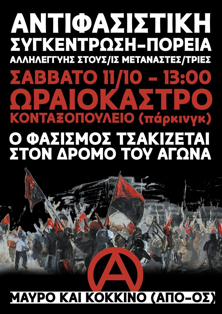 Αντιλαμβανόμαστε πως ο αγώνας ενάντια στον ρατσισμό, τον φασισμό και τον εθνικισμό δεν μπορεί να είναι αποκομμένος από την ίδια του την μήτρα – από το χέρι που τρέφει τέτοιες αντιλήψεις και τις διασπείρει σε ολόκληρη την κοινωνία. Ο αγώνας οφείλει να είναι αντικρατικός και η μάχη ενάντια στο σάπιο σύστημα εξουσίας, στο κράτος και το κεφάλαιο, απαιτεί συνεχή και οργανωμένο αγώνα. Ως αναρχικοί/ές στεκόμαστε δίπλα σε όλους τους καταπιεσμένους αυτού του κόσμου και κάνουμε σαφές πως καμία σπιθαμή γης δεν δύναται να δοθεί σε φασιστικά φρονήματα. Με όπλο μας την αλληλεγγύη και την αυτοοργάνωση δεν θα πάψουμε να παλεύουμε για την Ζωή και την Ελευθερία, για έναν νέο κόσμο. Έναν κόσμο ισότητας και αξιοπρέπειας – έναν κόσμο που θα μας χωράει όλους.