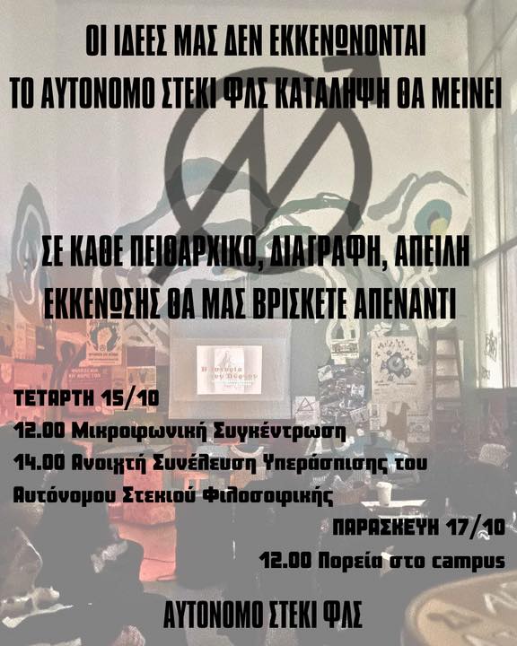 Μετά από μια σειρά αλλεπάλληλων εκκενώσεων, βιολογικό, μαθηματικό, φυσικό, ΑΚΙ, primavera κτλ. σχεδιάζεται και η εκκένωση του αυτόνομου στεκιού φιλοσοφικής. Εκμεταλλευόμενοι την ενεργειακή αναβάθμιση-ανακαίνιση του κτηρίου μεθοδεύεται η πλήρης αποστείρωση: βάφουν λευκούς τους τοίχους και "αποψιλώνουν" την Φιλοσοφική από τους πολιτικούς χώρους και κάθε είδους υλικό. Έρχονται τώρα με πρόσχημα την μεταφορά της γραμματείας του τμήματος από την πρυτανεία να μας ανακοινώσουν ότι δεν υπάρχει χώρος για μας. Δεν μας προκαλεί άλλωστε εντύπωση το ότι θέλουν να ελέγξουν την πρόσβαση των φοιτητών στο κτήριο διοίκησης ενεργοποιώντας ταυτόχρονα κάθε σύστημα ασφαλείας (κάμερες, τουρνικέ). Παράλληλα τα τμήματα καθηγητών που συνηγορούν στην εκκένωση του στεκιού είναι τα ίδια που συνυπογράφουν τα νέα μνημόνια συνεργασίας με το δολοφονικό κράτος του Ισραήλ. Όλα αυτά έρχονται και δένουν συνδυαστικά με την μεταφορά του μπατσοτμήματος στην ΔΕΘ, που προβλέπει όχι μόνο στην πλήρη αποστείρωση και τον εξευγενισμό του ΑΠΘ αλλά και την κανονικοποίηση της καταστολής και του διαρκούς ελέγχου στα πανεπιστήμια μας.