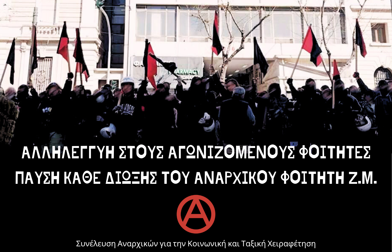Από την πλευρά μας ως αναρχικές-οί, ως εργάτες-τριες δεν μπορούμε παρά να βρεθούμε ξανά στο πλάι της αγωνιζόμενης νεολαίας, των φοιτητών, των μαθητών, των εκπαιδευτικών υπερασπιζόμενοι τον δημόσιο χαρακτήρα της παιδείας, όπως και όλων των κοινωνικών αγαθών, και τη δυνατότητα ελεύθερης πρόσβασης σ’ αυτά για όλες και όλους! Απέναντι στη συνολική επιχείρηση αλλαγής του κοινωνικού τόπου σε μία δυστοπία εκμετάλλευσης, υποταγής, εξαθλίωσης, αποκλεισμών, ανελευθερίας και καταστολής, η μόνη απάντηση είναι η αδιαπραγμάτευτη, ακηδεμόνευτη και αντιθεσμική αντίσταση μακριά από λογικές ανάθεσης και εξωραϊσμού του συστήματος. Ο μόνος δρόμος απέναντι στην εκπαιδευτική αναδιάρθρωση, την καταστολή, την υποβάθμιση των αναγκών και των εργασιακών μας κατακτήσεων είναι η μαζική αδιαμεσολάβητη μαχητική αντίσταση. Ο μόνος δρόμος είναι η συνέχιση και η κλιμάκωση του αγώνα μέσα από την περαιτέρω κοινωνικοποίησή του και διασύνδεσή του με τους αγώνες υπεράσπισης όλων των κοινωνικών αγαθών με ορίζοντα την συνολική ανατροπή του κρατικού και καπιταλιστικού οικοδομήματος που γεννά και αναπαράγει την εκμετάλλευση και καταπίεση ανθρώπου από άνθρωπο, για μια ελευθεριακή παιδεία σε μια κοινωνία ισότητας, αλληλεγγύης και ελευθερίας.