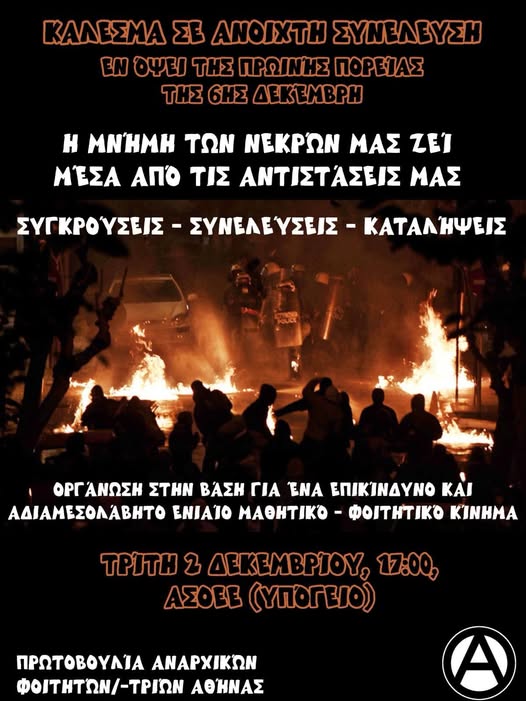 Για να διατηρήσουμε την εξεγερσιακή και επαναστατική μνήμη των αγώνων που έγιναν, για να δηλώσουμε σαφώς σε όλους τους τόνους πως η αναρχία είναι δυναμικά παρούσα, παρά τις προσπάθειες της καταστολής και των διαφόρων ρουφιάνων, καλούμε σε συνέλευση για την συγκρότηση αναρχικού φοιτητικού μπλοκ στην πρωινή πορεία της 6ης Δεκέμβρη, την Τρίτη 2/12, στις 17:00, στην ΑΣΟΕΕ.