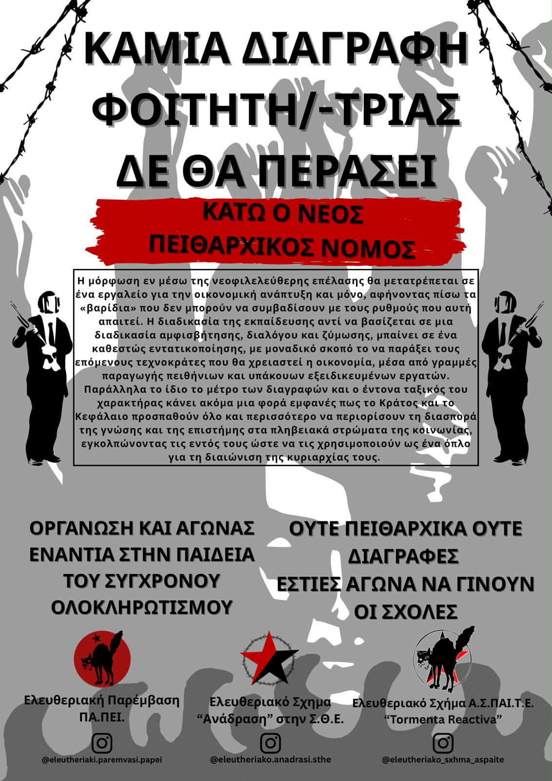 Η επιβολή των διαγραφών μετά από το πέρασμα ενός αυθαίρετου αριθμού εξαμήνων, τιμωρώντας όσους και όσες δε χωρούν στα καλούπια της λεγόμενης ακαδημαϊκής «αριστείας», δεν αποτελεί απλώς μια μεμονωμένη επίθεση στις σπουδές μας, αλλά αντιθέτως είναι δομικό κομμάτι της ευρύτερης και συνολικής επίθεσης που έχει εξαπολύσει το κράτος στο κοινωνικό αγαθό της παιδείας. Από την υποβάθμιση της φοιτητικής μέριμνας, την ουσιαστική κατάργηση των φοιτητικών εστιών στα περισσότερα πανεπιστήμια και τον περιορισμό στον αριθμό των δικαιούχων δωρεάν σίτισης σε μια σειρά σχολών μέχρι τον νόμο Πιερρακάκη που άνοιξε τον δρόμο για την ίδρυση των πρώτων ιδιωτικών πανεπιστημίων. Από την κατάργηση του πανεπιστημιακού ασύλου το 2019 και τις προσπάθειες για επιβολή ελεγχόμενης εισόδου στις σχολές, τη θέσπιση της πανεπιστημιακής αστυνομίας και την προσπάθεια τοποθέτησης καμερών μέσα στα πανεπιστήμια μέχρι την ψήφιση του νέου πειθαρχικού δικαίου που ουσιαστικά στοχοποιεί και ποινικοποιεί την πολιτική δραστηριοποίηση μέσα στις σχολές. Από τη συνεχή συγχώνευση σχολικών τμημάτων, δημιουργώντας τάξεις πολλών δεκάδων μαθητών και καταργώντας ουσιαστικά τη δυνατότητα ουσιαστικής πραγματοποίησης του μαθήματος, την έλλειψη σε καθηγητές και σε υποδομές και την ίδρυση των νέων Ωνάσειων σχολείων σε κάποιες από τις πιο ταξικά πληττώμενες περιοχές της Αθήνας, εκτοπίζοντας τα παιδιά που δε θα δικαιούνται να ενταχθούν σε αυτά από τα σχολεία της γειτονιάς τους, μέχρι τις πειθαρχικές ποινές που αντιμετωπίζουν οι αγωνιζόμενοι/-ες εκπαιδευτικοί, που παλεύουν για την εργασιακή τους αξιοπρέπεια σε ένα καθεστώς πλήρους υποβάθμισης του δημόσιου σχολείου.