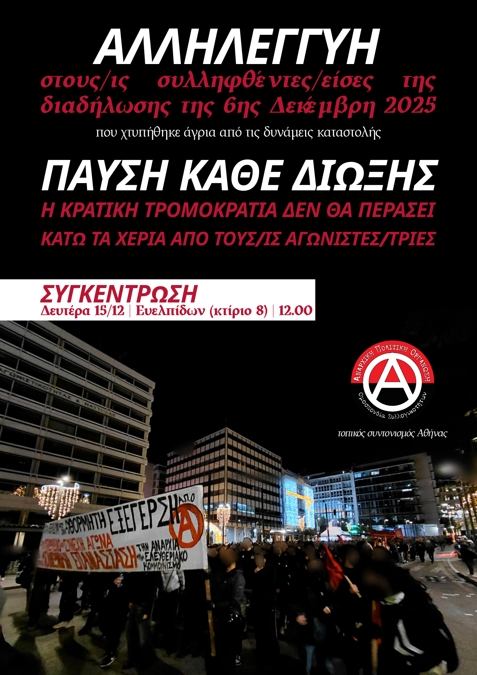 Οι δυνάμεις καταστολής στις 6/12/2025 χτύπησαν άγρια, παντελώς απρόκλητα και συντονισμένα μεγάλο μέρος της πορείας και ειδικότερα τα αναρχικά μπλοκ