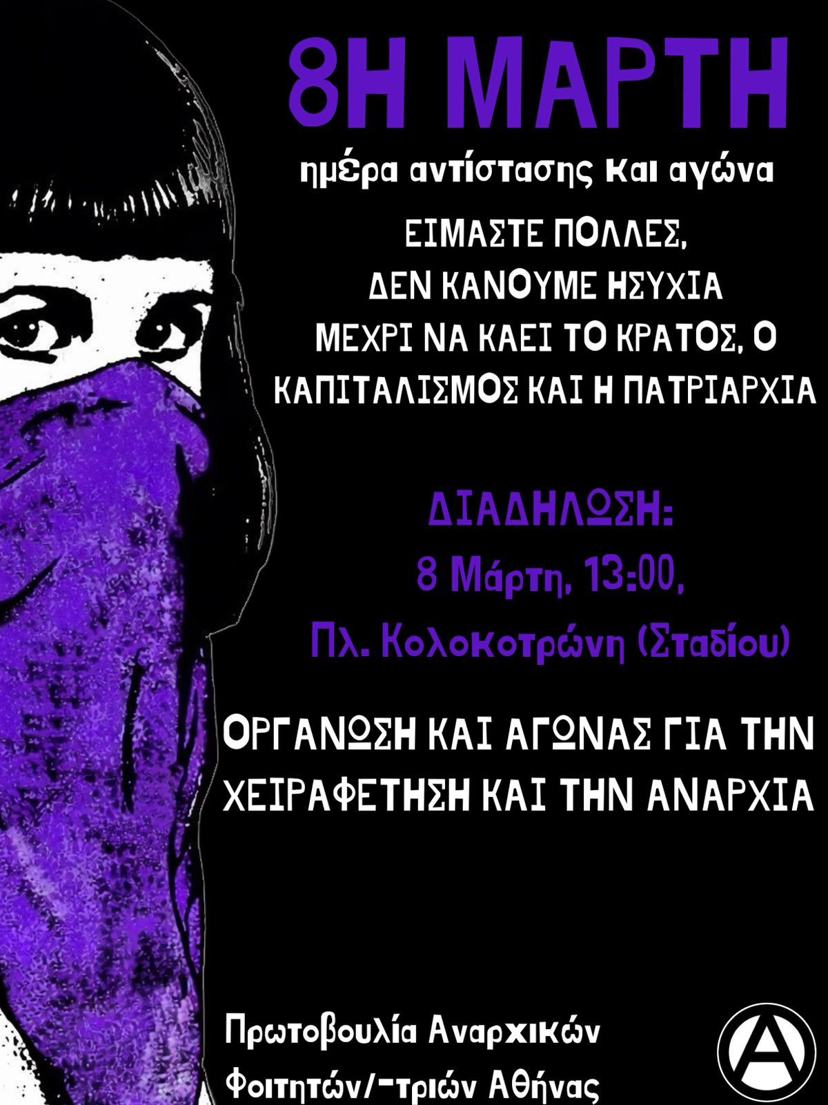 Η 8η Μάρτη, παγκόσμια ημέρα της γυναίκας, είναι ημέρα μνήμης, αντίστασης και αγώνα απέναντι σε κράτος, κεφάλαιο και πατριαρχία. Η θέσπιση της, οφείλεται στις διεκδικήσεις και τις θυσίες των αγωνιστριών του φεμινιστικού και εργατικού κινήματος του 19ου και 20ου αιώνα, οι οποίες έδωσαν αγώνες για την απόκτηση ίσων δικαιωμάτων, όπως αυτό της ψήφου, αλλά παράλληλα και αγώνες με ταξικό πρόσημο, για καλύτερες συνθήκες εργασίας, με μαζικές απεργίες και διαμαρτυρίες. Η ιστορία της 8ης Μάρτη, φανερώνει τη στενή σύνδεση μεταξύ των αγώνων για ισότητα στο κοινωνικό και στο ταξικό πεδίο και μας δείχνει ότι η απελευθέρωση των γυναικών, όπως και καμίας άλλης κοινωνικής ομάδας, δεν μπορεί να επέλθει όσο υπάρχει κράτος και καπιταλισμός. Σε αντίθεση με τους ισχυρισμούς της εξουσίας, τα αιτήματα της 8ης Μάρτη παραμένουν εξαιρετικά επίκαιρα, καθώς οι ίδιοι εξουσιαστικοί θεσμοί ενάντια στους οποίους εξεγείρονταν οι γυναίκες του 19ου αιώνα, συνεχίζουν να καταπιέζουν και να καταπνίγουν την κοινωνική βάση μέχρι σήμερα.